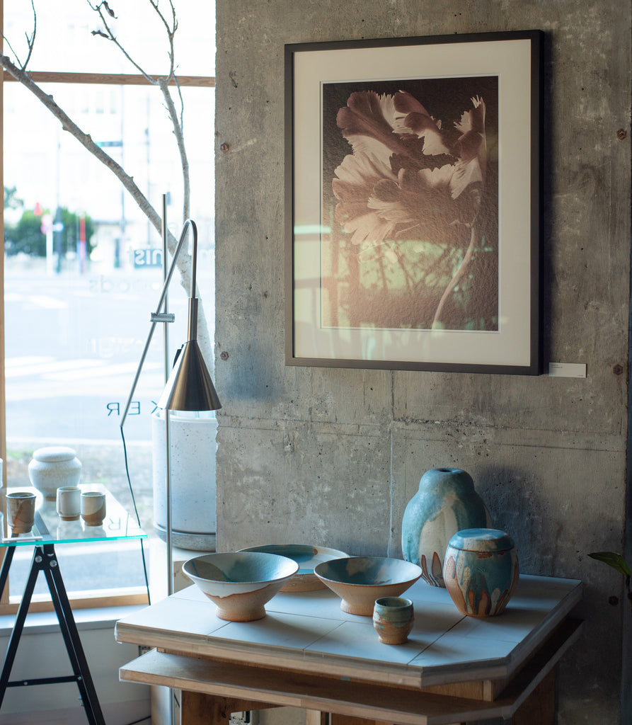 伊豆下田にある海が一望できるアトリエから生み出されるマークの作品は、白浜やビーチに寄せる波を表現しているかのよう。もともと写真家である彼の作品は、とても繊細な造形で、そこに自然からイスパイアされたような有機的な美しい柄、色が印象てきである。500年以上保つといわれているプラチナムプリントという技法の彼の写真の作品も併せて展示した。まるで絵画を思わせる完成度がどこまでも高い作品も魅力的。