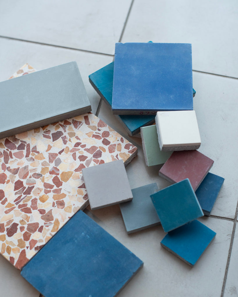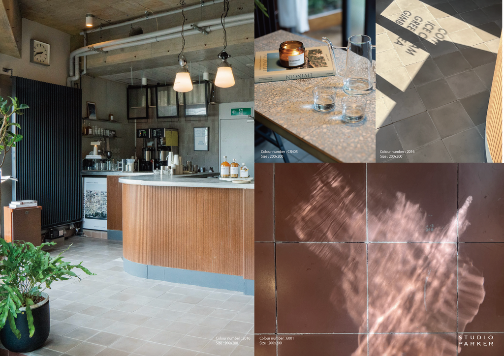 STUDIO PARKER では床や壁、什器などにさまざまなカラーのセメントタイルを使用しています。